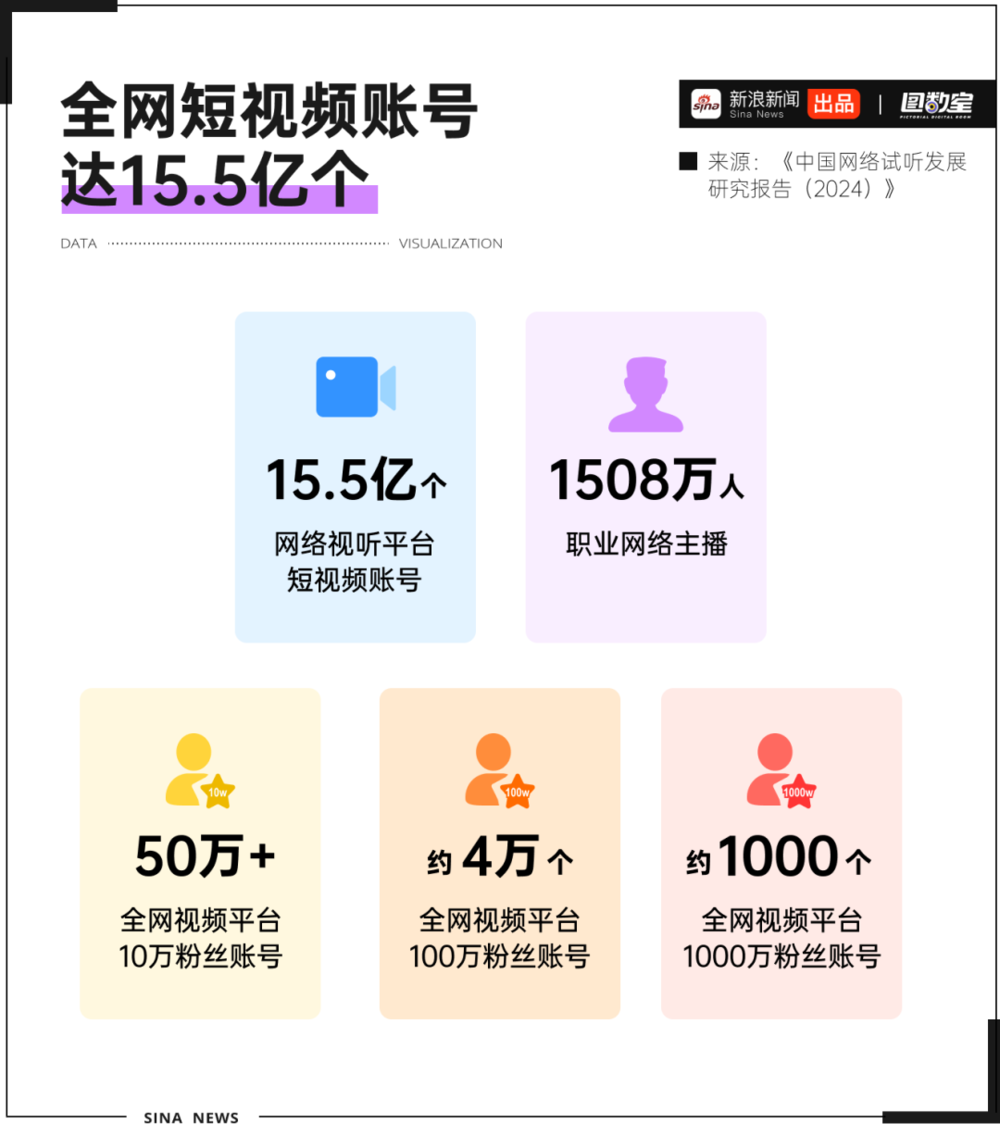 《中国网络视听发展研究报告(2024)》显示,截至2023年12月,全网短视频账号总数达15.5亿个,职业主播数量已达1508万人。全网主要视听平台拥有10万粉丝的账号数量超50万个,拥有100万粉丝的账号数量约为4万个,拥有1000万粉丝的账号数量只有1000个。