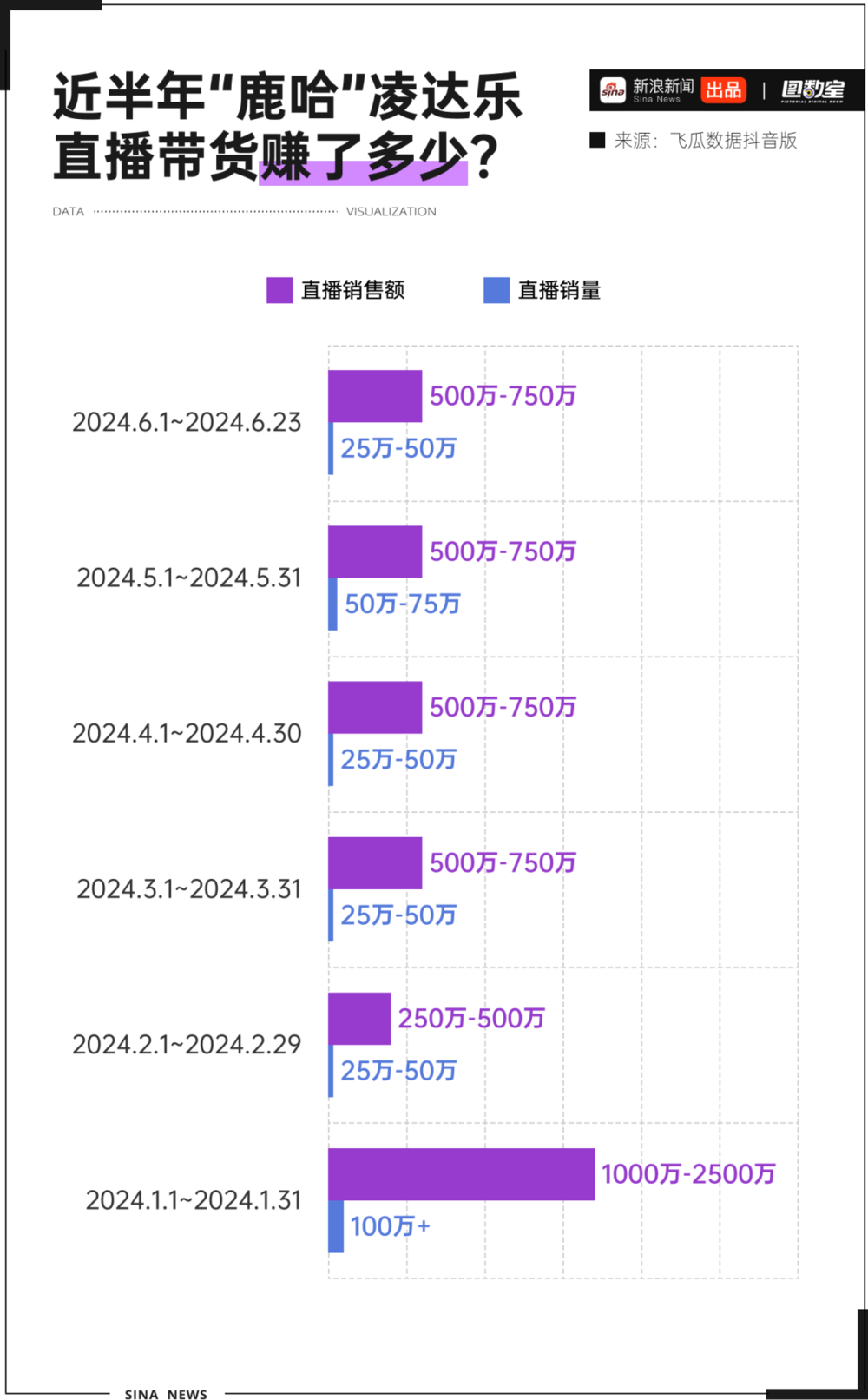 图数室查询这半年间凌达乐的直播带货发现,仅半年时间其直播带货赚的钱就在2500万到5000万之间,一个月卖出50万左右货,均场直播时长仅在2小时。