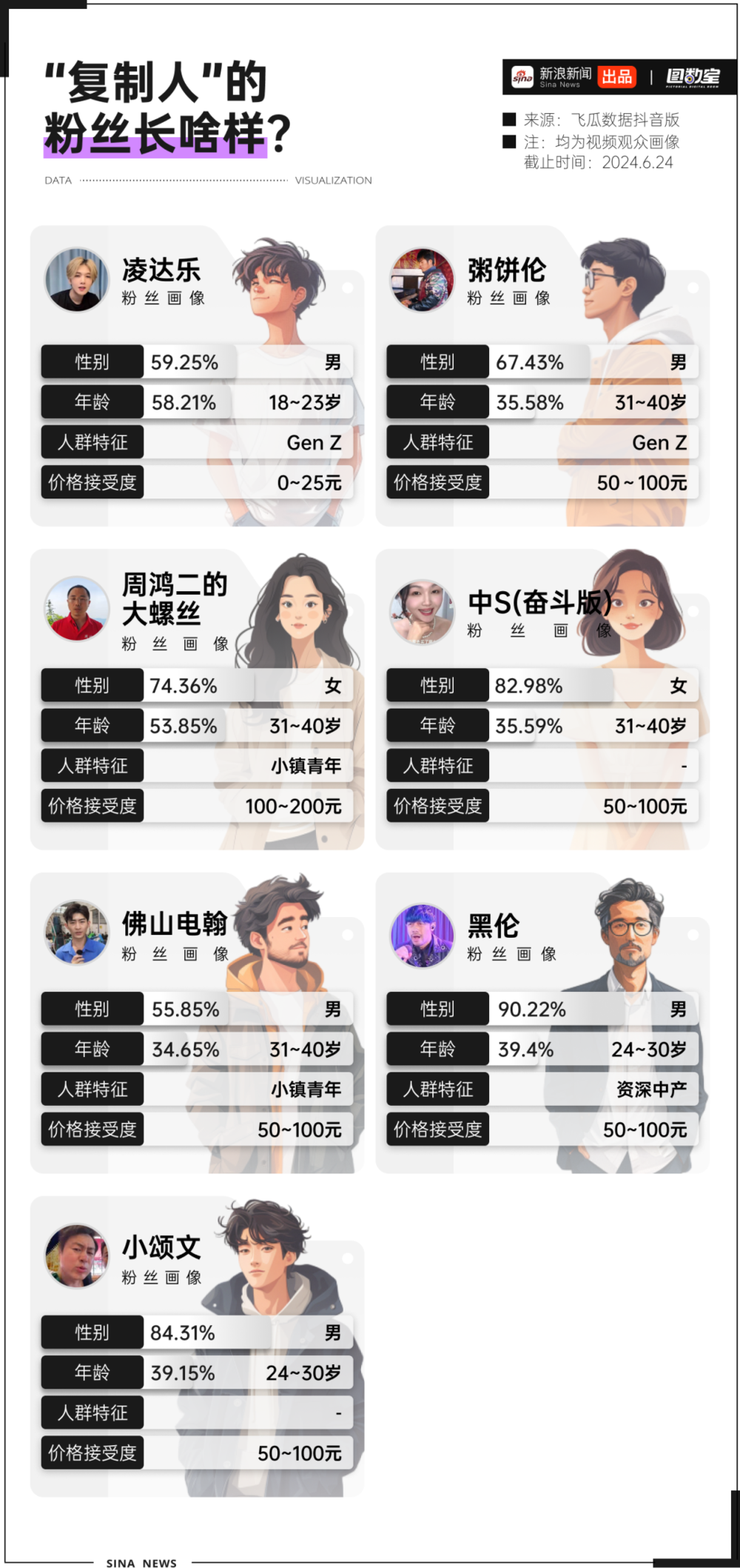 凌达乐的观众画像,年龄在18~23岁之间,整体是更偏年轻化的“genz”人群;周杰伦的粉丝多是80、90后,而“黑伦”和“粥饼伦”的观众画像也处在24~40岁之间。“复制人”的受众范围从genz到小镇青年,从新锐白领到资深中产,几乎囊括了整个互联网人群。