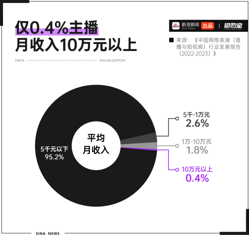 根据《中国网络表演(直播与短视频)行业发展报告(2022-2023)》,以直播为主要收入来源的主播中,95.2%月收入为5000元以下,仅0.4%主播月收入10万元以上。