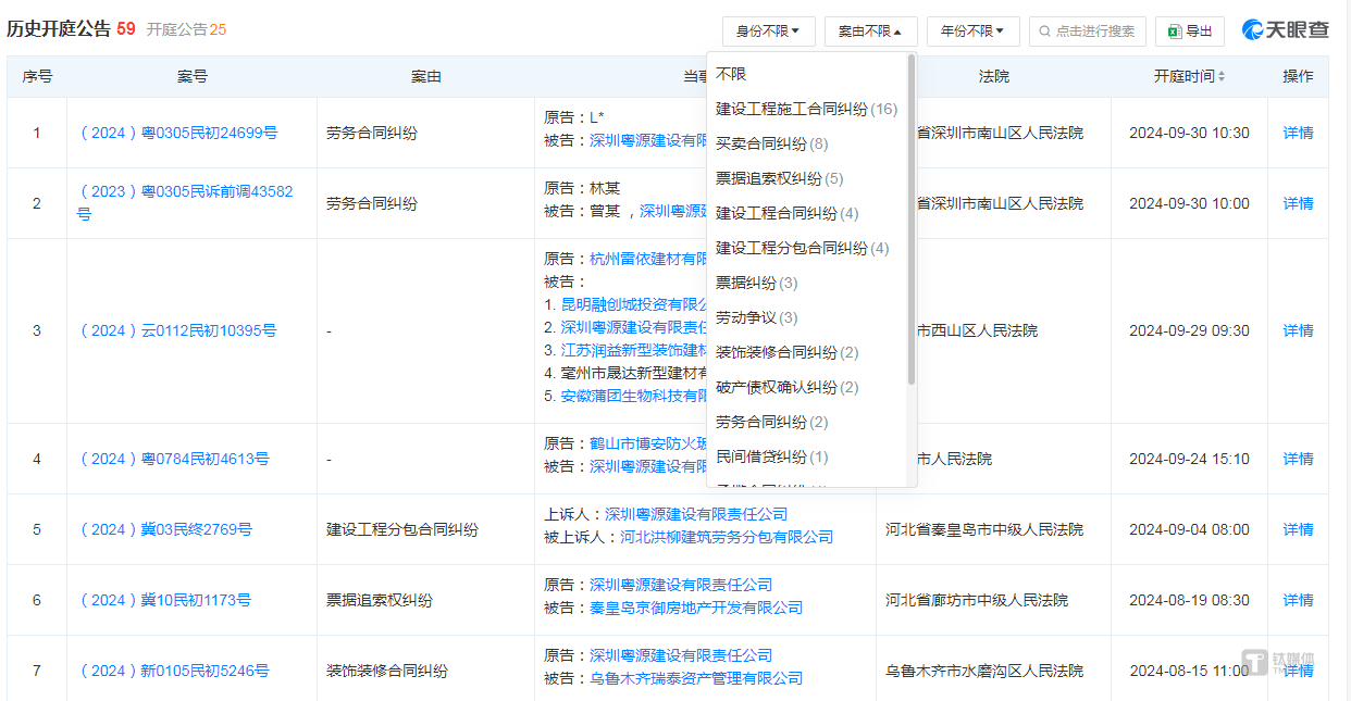 需要说明的是,上述讼诉案件仅仅是深圳粤源历史的冰山一角。天眼查显示,深圳粤源历史涉及59起诉讼案件,案件类型包含建设工程施工合同纠纷、买卖合同纠纷等。