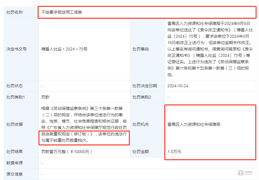 除了诉讼之外,还有一起行政处罚也引人关注。天眼查显示,深圳粤源因不按要求报送用工信息被番禺区人力资源和社会保障局处罚1万元。具体事由为,番禺区人力资源和社会保障局于2024年9月8日向深圳粤源送达了《责令改正通知书》(穗番人社监〔2024〕75号),要求深圳粤源于2024年9月16日前改正上述行为,但深圳粤源逾期未作改正。以上事实有询问通知书、调查询问笔录和《责令改正通知书》(穗番人社监〔2024〕75号)等证据证实。上述行为违反了《劳动保障监察条例》第六条和第十五条第一款第(三)项的规定。