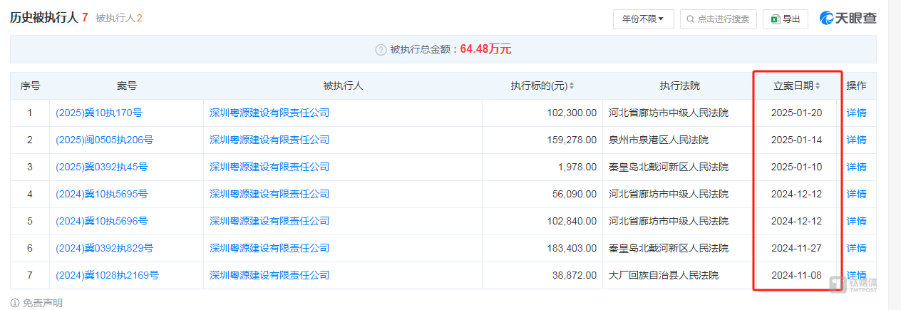 另外,2024年11月-2025年2月期间,深圳粤源先后7次成为了被执行人,被执行总金额64.48万元。