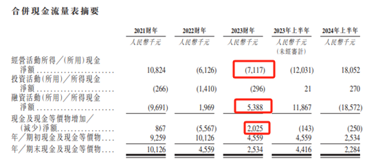 事实上,在粤源建设的现金流量表中,公司披露的相关数据也令人匪夷所思。2023财年,粤源建设经营活动产生的现金流量净额为-711.7万元,投资活动产生的现金流量净额为-29.6万元,融资活动产生的现金流量净额为538.8万元,以此计算,2023财年,粤源建设的现金及现金等价物将减少202.5万元,但是粤源建设自身却披露该年的现金及现金等价物将增加了202.5万元。为何粤源建设的申报稿会出现如此低级失误?