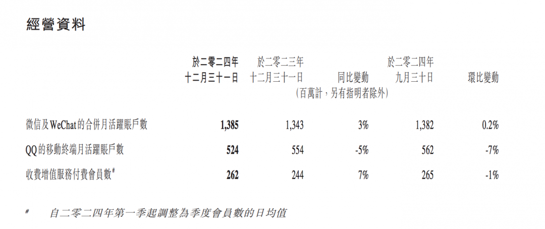 Home科技腾讯控股:微信及WeChat合并月活账户数增至13.85亿 科技 2025 年 3 月 19 日 腾讯控股:微信及WeChat合并月活账户数增至13.85亿 By 古方信息网 - Advertisement - 【TechWeb】3月19日消息,腾讯控股最新公布的2024年度财报显示,截至2024年12月31日,微信及WeChat合并月活账户数为13.85亿,上年同期为13.43亿,同比增长3%。 QQ移动终端月活跃账户数为5.24亿,相较之下上年同期为5.54亿,同比下滑5%。 收费增值服务付费会员数为2.62亿,同比增长7%。其中,腾讯视频付费会员数达到1.13亿,腾讯音乐付费会员数增至1.21亿。 - Advertisement - Must Read 基金 算电协同成为新基建核心,电网设备ETF国泰(561380)盘中大涨超1.4%,连续5日资金净流入近2亿元 每日经济新闻 - 2026 年 4 月 4 日 - Advertisement - 贵金属 一张图看商品支撑阻力:金银油气+铂钯铜农产品期货(2026年3月20日) 2026 年 4 月 4 日 股票 德邦股份:公司股票将于2026年3月31日终止上市;ST开元:或被实施退市风险警示|公告精选 2026 年 4 月 4 日 24小时 乘联会:3月全国乘用车新能源市场零售78.4万辆 同比下降21% 2026 年 4 月 4 日 Related News 基金 算电协同成为新基建核心,电网设备ETF国泰(561380)盘中大涨超1.4%,连续5日资金净流入近2亿元 2026 年 4 月 4 日 贵金属 一张图看商品支撑阻力:金银油气+铂钯铜农产品期货(2026年3月20日) 2026 年 4 月 4 日 股票 德邦股份:公司股票将于2026年3月31日终止上市;ST开元:或被实施退市风险警示|公告精选 2026 年 4 月 4 日 24小时 乘联会:3月全国乘用车新能源市场零售78.4万辆 同比下降21% 2026 年 4 月 4 日 世界 美国最新零售数据止住跌势 但市场已将目光投向战火下的三月 2026 年 4 月 4 日 - Advertisement -