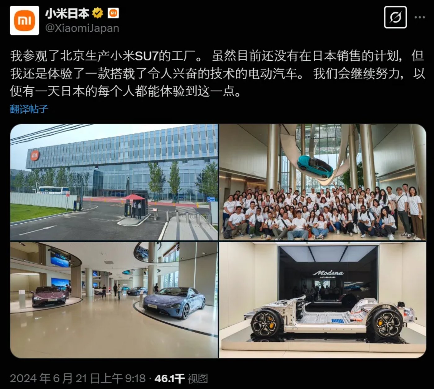 从这个模式推断,小米在日本开“小米之家”实体店,从手机迈向IoT硬件的下一步,或许就是在海外推出汽车业务。此前,小米日本的推特账号也曾专门发布关于日本员工进入小米汽车工厂,体验小米SU7的内容,并声称会努力争取让日本的用户也能体验到这台车。