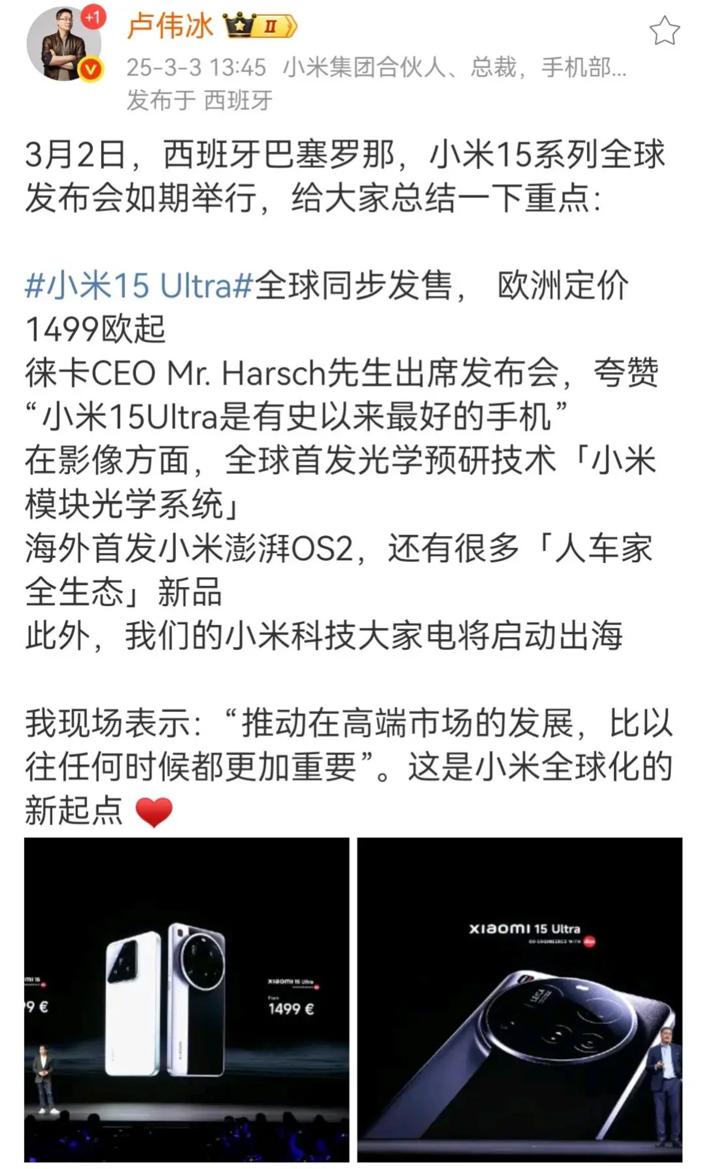今年3月,卢伟冰在巴塞罗那的小米全球发布会上表示,小米科技大家电将启动出海,并透露小米汽车计划在 2027 年正式进军海外市场。