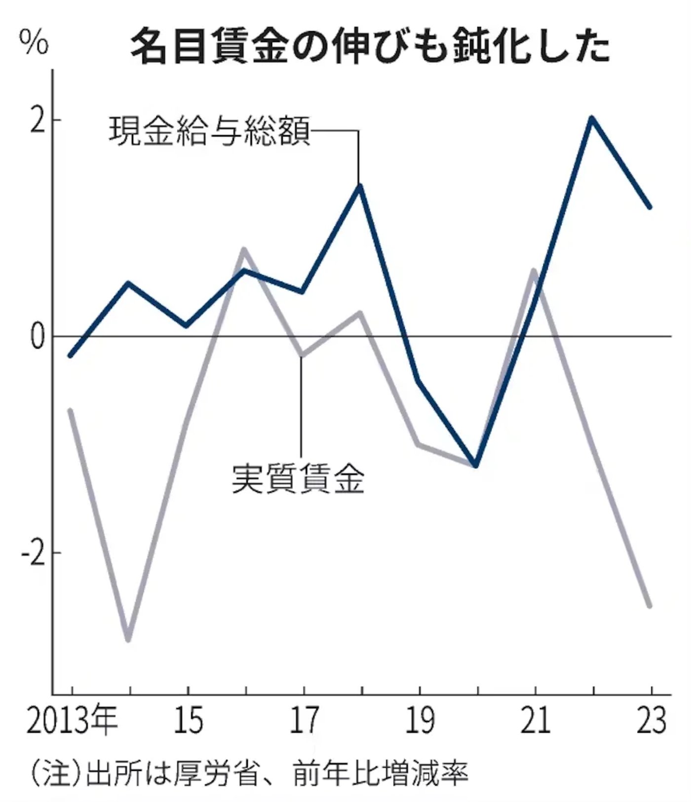 日本人的实际薪资创1990年以来最低水平(图源:日本经济新闻)