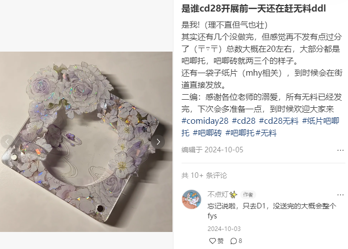 在官谷之外,同人制品价格相对实惠,但又存在提前收货问题。不点灯很喜欢购买同人制品,在她看来,好的工艺加好的美工和图是绝杀。但因其通常在微店开售,消费者需要提前收货。一旦碰见社团跑路、制品问题,消费者会发现很难得到售后保障。