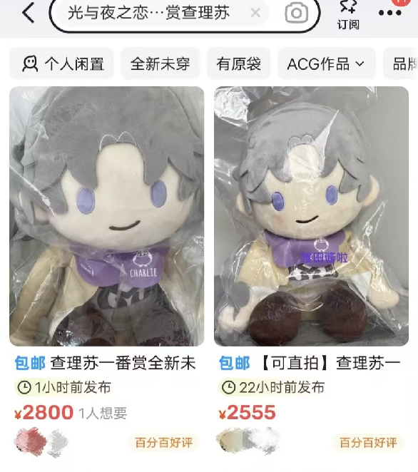 溢价/黄牛问题与官谷如影随形,还总会给玩家带来一丝焦虑。在吃谷生涯中,卡皮记忆中最难抢的周边是2022年《光与夜之恋》首次发售的一番赏。其它三名热门角色的套装价约500元,而当时的热门角色查理苏套装已涨至近1000元。卡皮想过在发售前夜排收一整箱再卖。焦虑好几天,最终在闲鱼用真诚打动一名姐妹,以500元拿下心仪周边,但并非套装,仅包含一个娃娃。