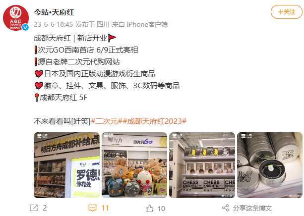 经过多轮调整,天府红逐步摸索构建出多面貌的二次元生态。尤其在分别引入三坑文化和谷玩市场等板块后,2023年6月,以“次元GO”西南首店的火爆开业为节点,天府红决定将谷子店作为核心卖点。这座商场也逐步被贴上“成都秋叶原”的标签,成为市中心的新打卡地。