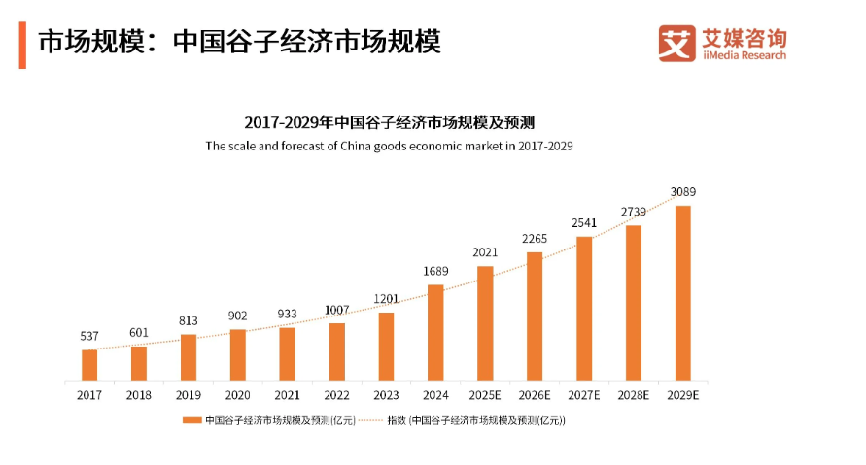 爱与经济交融的这把收入算盘,赚得噼啪作响。据艾媒咨询数据显示,2024年,中国谷子经济市场规模达到1689亿元,同比增长40.62%。到2029年,这个数字将突破3000亿元。