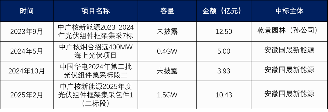 短短9天后的2023年9月25日,中广核工程有限公司发布中标通知书,安徽国晟新能源成功中标“中广核新能源2023至2024年光伏组件框架集采”的第七标段,容量为1GW,中标总价为12.5亿元。