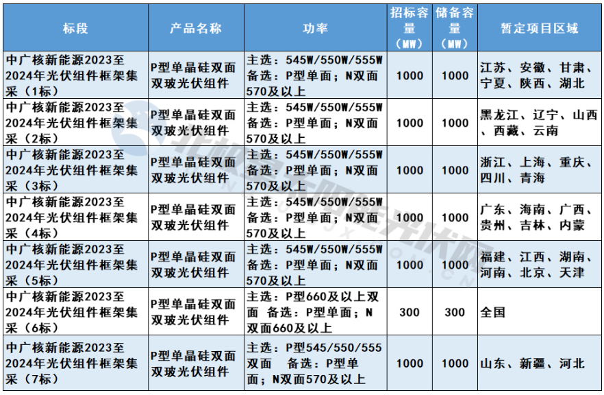 2023年7月12日,中广核新能源发布2023至2024年光伏组件框架集采,总招标容量12.6GW。本招标项目划分为7个标段:
