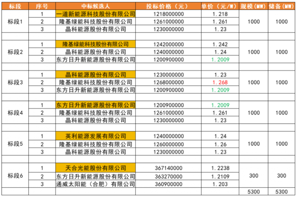 此次中标单价在1.24元/W~1.26元/W之间,其中最高价由隆基绿能投出,最低价由晶科能源投出。