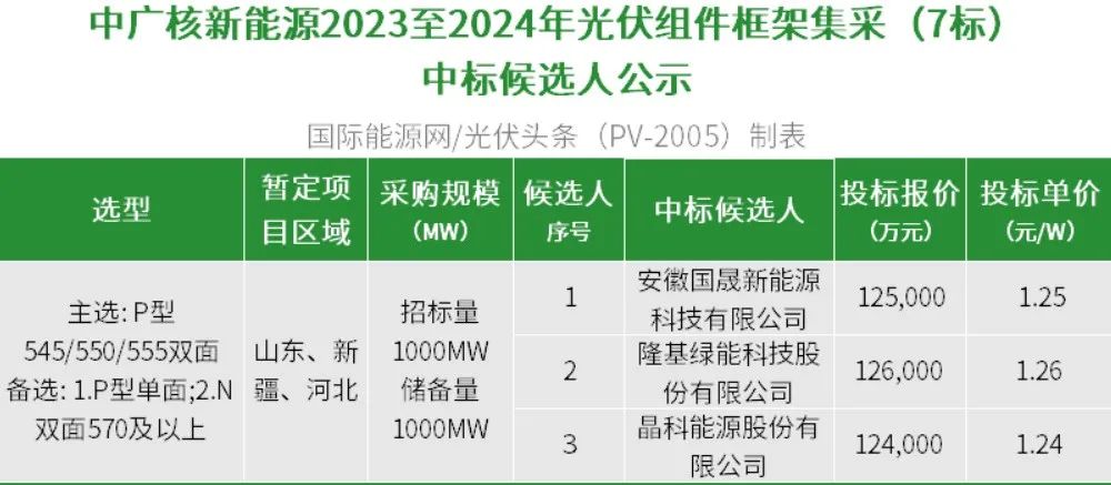 半个月以后,2023年9月14日,中广核新能源2023至2024年光伏组件框架集采(7标)中标候选人公示。安徽国晟新能源科技有限公司、隆基绿能科技股份有限公司、晶科能源股份有限公司3家企业入围。