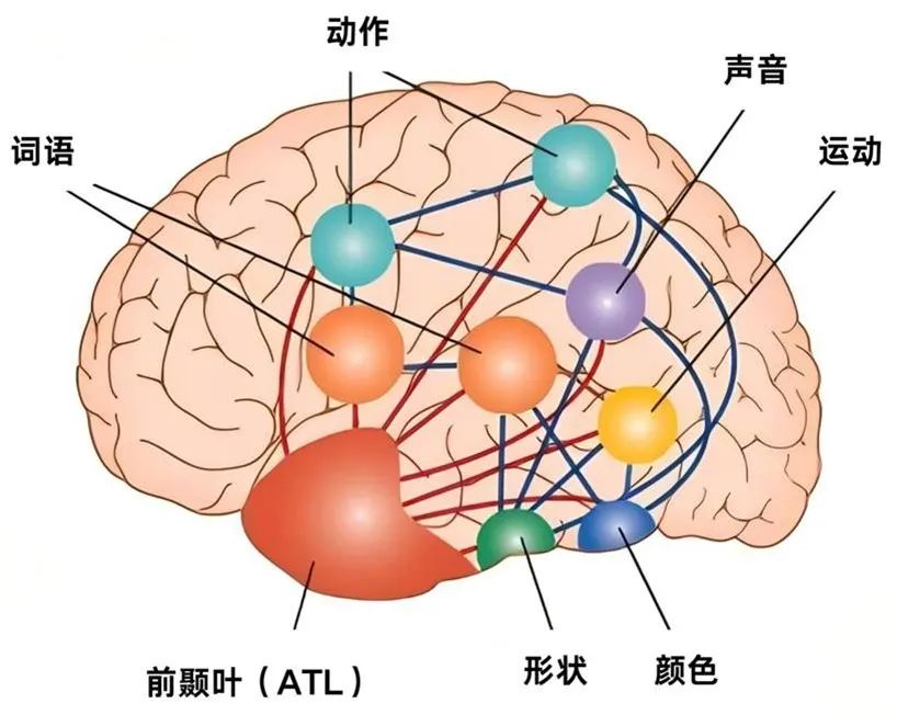 这个模型可以用一个简单的比喻来理解:想象大脑像是一个知识网络,ATL就是网络的“中央枢纽(Hub)”,而不同感官区域(如视觉、听觉、触觉等)则像是一根根“辐射出去的线路”。当我们获取新知识时,来自不同感官的信息(例如看到苹果的红色、摸到它的光滑、听到别人说“苹果”)都会被传输到ATL并整合,形成一个完整的“苹果”概念。