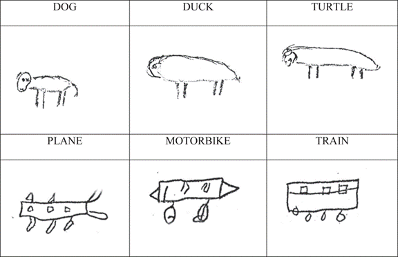 ▷语义性痴呆的常见筛查方式——绘图 患者的绘图中能观察到,物体失去了其独特特征,例如没有喙或羽毛的鸭子,没有壳的乌龟。患者倾向于将所有物体画成相同的原型,如所有动物和所有交通工具都被画成了相同的形状。同时,还会出现错误插入的情况,例如四条腿的鸭子,摩托车上有窗户。图源:[2]