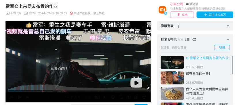 2024年7月,56岁的雷军还交了一份自己驾驶SU7表演漂移的视频作业。连小米公司的官方账号也在玩梗“雷军交上来网友布置的作业”,只因有网友一直催雷军表演漂移。