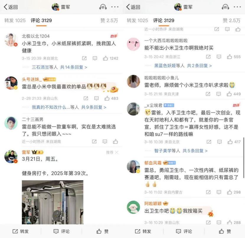 被3·15曝光的卫生巾,成为了雷军许愿池的常客。事实上,在2024年11月,多家卫生巾品牌被曝质量问题时,就有人许愿让雷军做卫生巾。