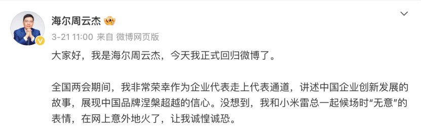 更戏剧性的“带货场景”发生在两会现场。两会期间,雷军热情和粉丝打招呼,而站在雷军身后的周云杰露出了一些列略显无奈且被迫营业的表情,被网友做成了各种表情包后走红网络。
