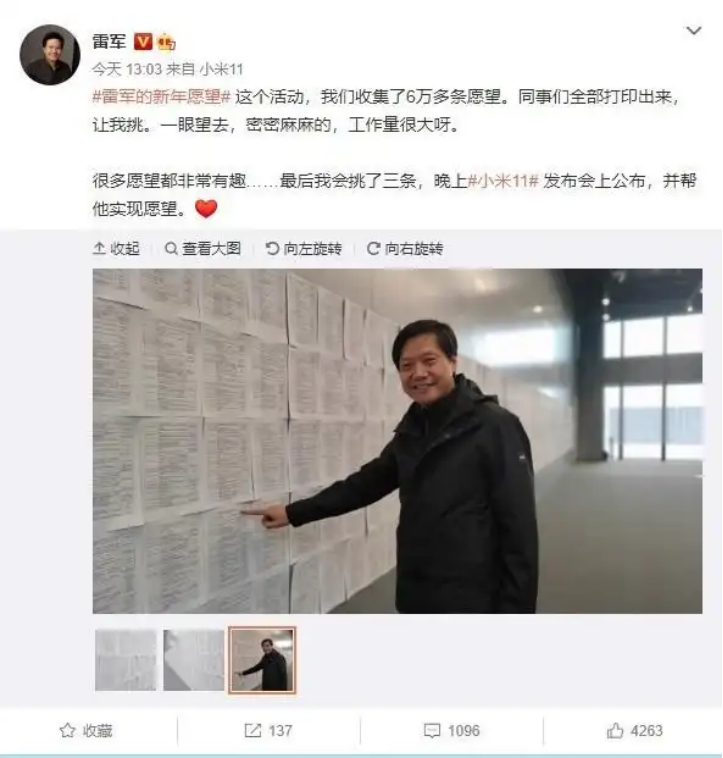 小米将“实现许愿”摆在明面上来营销,是在2020年。这一年年底,雷军在自己的微博上公布了2021年的三个愿望,其中就有一个是“帮米粉实现一些愿望”。当时,雷军在微博说,这个活动收集了6万多条愿望,最终会挑其中三条来帮助实现。