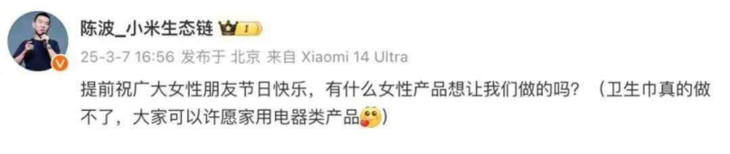 但并非所有愿望都能被雷军实现。“呼吁雷军做卫生巾”的话题冲上热搜后,陈波在微博回应,“提前祝广大女性朋友节日快乐,有什么女性产品想让我们做的吗?(卫生巾真的做不了,大家可以许愿家用电器类产品。)”后来,陈波删除了这条博文。