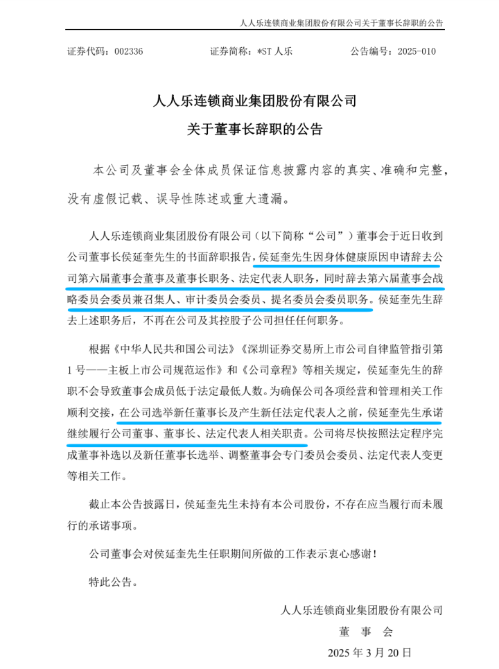 曾被誉为“民营超市第一股”的人人乐(*ST人乐,002336.SZ)近日发布公告称,董事长侯延奎因健康原因辞去公司所有职务,这已是该公司六年内的第三次掌舵人更迭。
