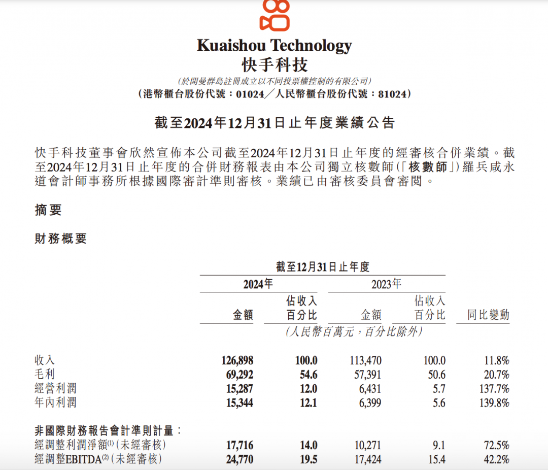 2024年全年,快手总营收同比增长11.8%至1269亿元,经调整净利润同比增长72.5%达177亿元。