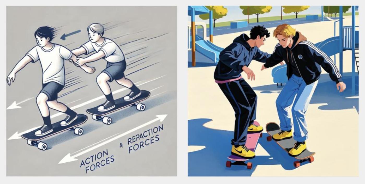 生成一张图,用两个站在滑板上的人推对方的动作来解释牛顿第三定律。要求画面直观,能清楚展示作用力和反作用力的关系。