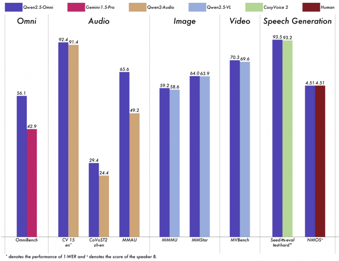 阿里云介绍,在权威的多模态融合任务OmniBench等测评中,Qwen2.5-Omni全维度远超Google的Gemini-1.5-Pro等同类模型。在语音理解、图片理解、视频理解、语音生成等领域的测评分数,均领先于专门的Audio或VL模型,且语音生成测评分数(4.51)达到了与人类持平的能力。