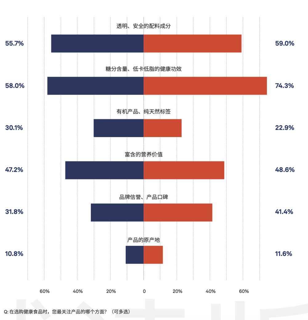 健身人从冰美式到电解质水,也开始为无糖茶饮买单。结合精练GymSquare《2023中国健身和健康生活方式行业报告》:在健康食品的选购方面,“糖分含量、低卡低脂的健康功效”一举拔得头筹,是74.3%的女性、58%的男性消费者对于健康食品最关注的因素;其次是“透明、安全的配料成分”、此后依次为营养价值、品牌口碑、纯天然标签等。