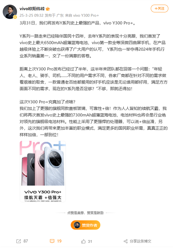 去年底,vivo推出了vivo Y300系列机型,其中vivo Y300 Pro首发搭载了年度最大的6500mAh超薄蓝海电池,打破了蓝海电池容量纪录,也刷新了vivo电池容量新高。而日前vivo官方宣布,将在3月31日推出全新的vivo Y300 Pro+机型,将在续航表现上进一步提升。现在有最新消息,近日vivo产品副总裁欧阳伟峰进一步带来了该机的更多升级细节。