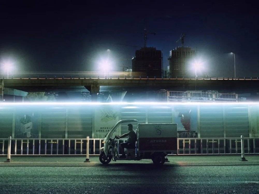 晚上,下夜班的快递员,这条路是城市的夹角,隐藏在围墙后面(牛童摄影作品)