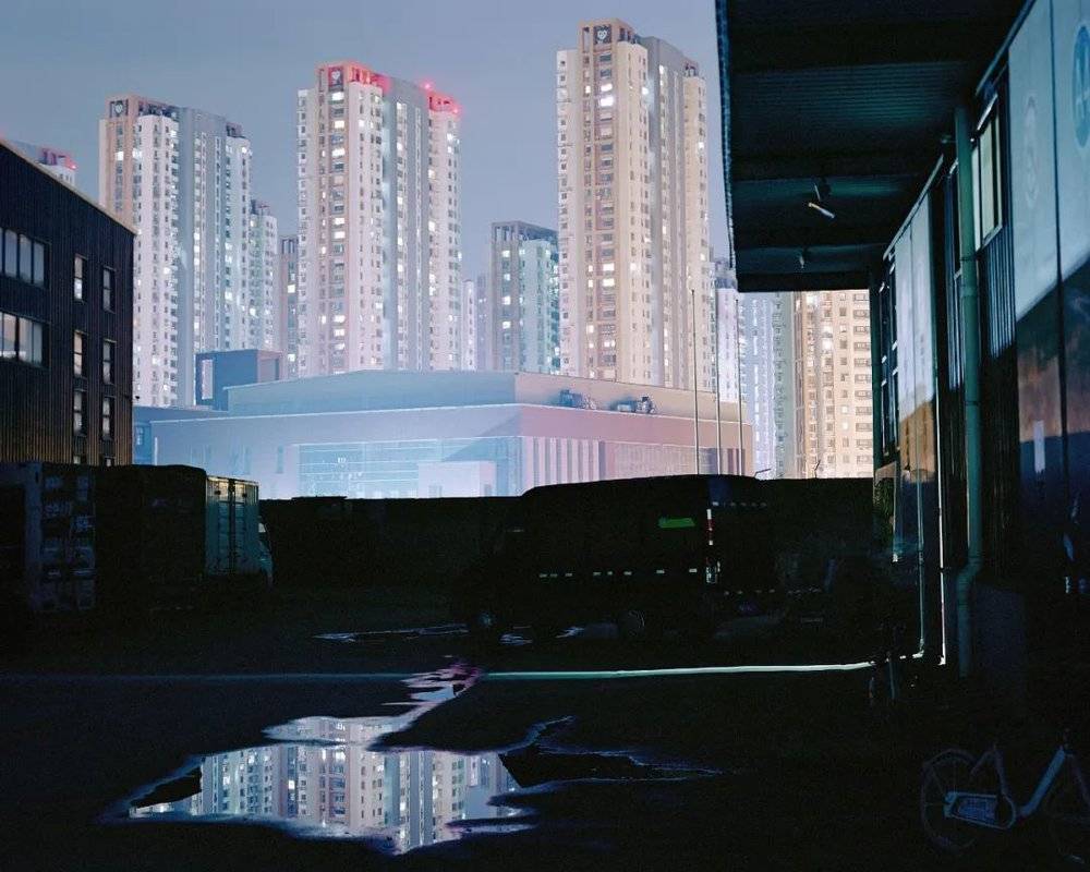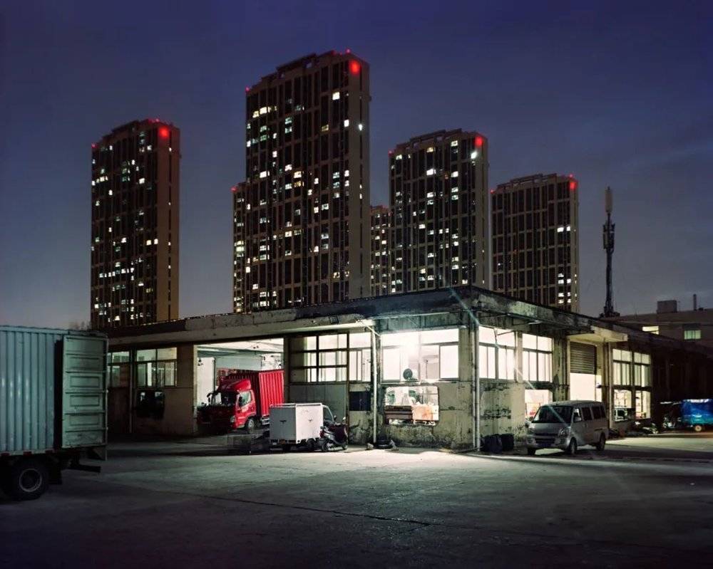 远处的楼宇灯火通明,眼前的快递工厂显得黯淡且渺小。(牛童摄影作品)