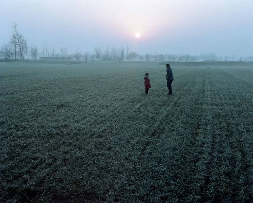 许多快递员和母亲一样,也被这样的情绪反复拉扯。一个叔叔年轻时在城市里工作,后来还是又回到了农村,并在农村安家,他在这会感到安稳。在和他的交谈里,我能明确感受到他对农村的眷恋之情。渐渐地,他在农村里得到了一些情感上的慰藉。在清晨我给他和女儿拍摄了一张照片,他们站在故乡的田间,祖坟就静静矗立在不远的地方。