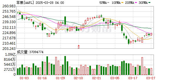 今年以来,去年高歌猛进的苹果股价一路震荡下跌,截至当地时间3月27日收盘,苹果股价报223.85美元,年内已跌超10%,总市值蒸发了超4200亿美元(约合人民币3.05万亿元)。