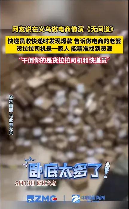 还有一个极致的案例是,最近有热搜爆料,有人说在义乌做电商就像在演《无间道》,快递员上门收快递时发现爆款,转头就告诉做电商的老婆,楼下配货的货车司机可能跟快递员是一家人,马上就能精准找到你的货源,并迅速复制。
