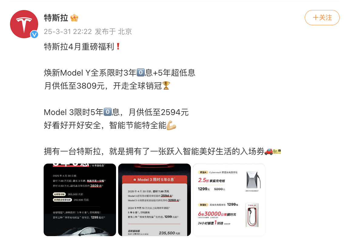 3月31日晚间,特斯拉中国宣布推出全新的限时购车政策:4月30日前,焕新Model Y首次全系推出限时3年0息和5年超低息购车金融政策,月供低至约3809元。另外4月30日前,Model 3后轮驱动版/长续航全轮驱动版推出限时5年0息政策,月供低至2594元。