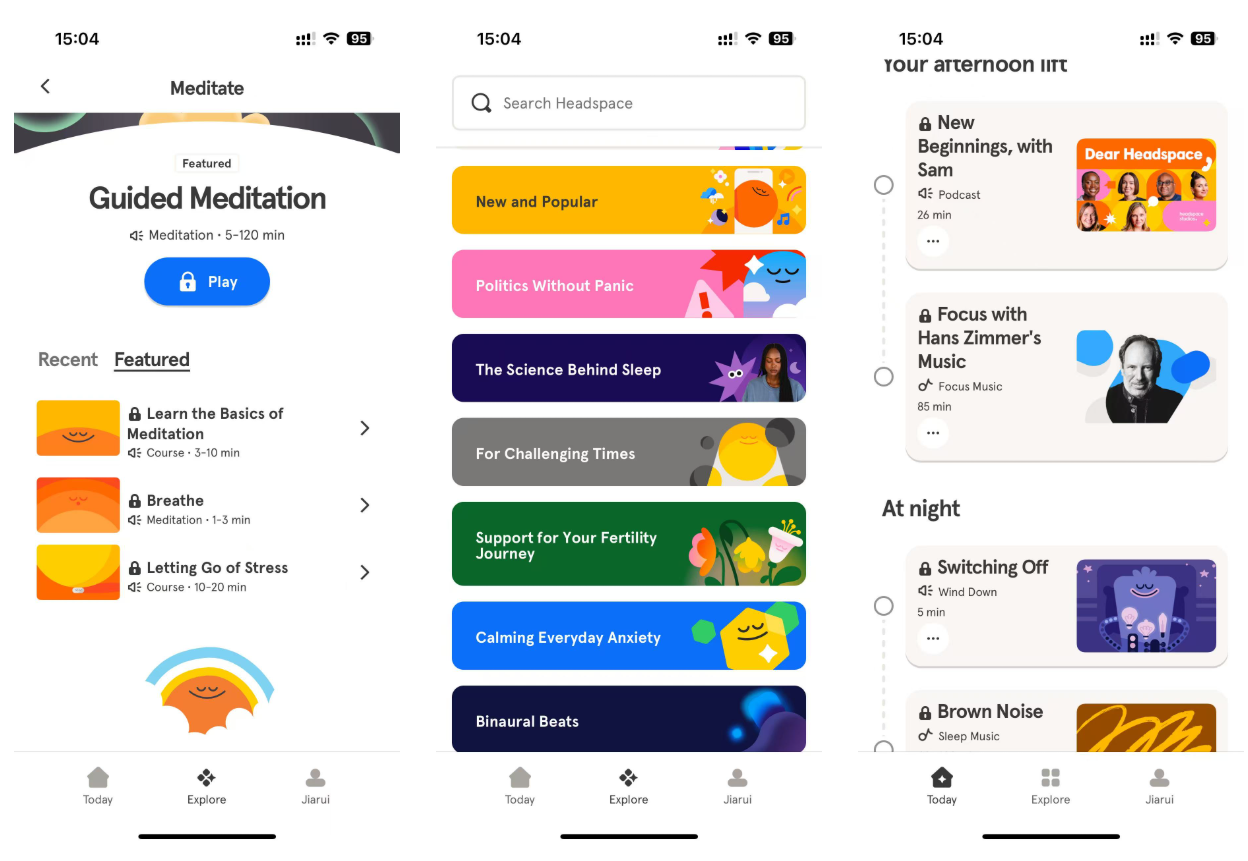 - 情绪分析:通过用户的反馈(例如,使用后填写的情绪感受调查)以及与应用互动的方式,AI 能够进一步分析用户的心理状态,并根据其情绪变化调整推荐。例如,AI 会识别出焦虑的用户,向他们推荐更为舒缓和放松的冥想内容,而对那些情绪低落的用户,AI 则会推荐提升心情或缓解压力的课程。