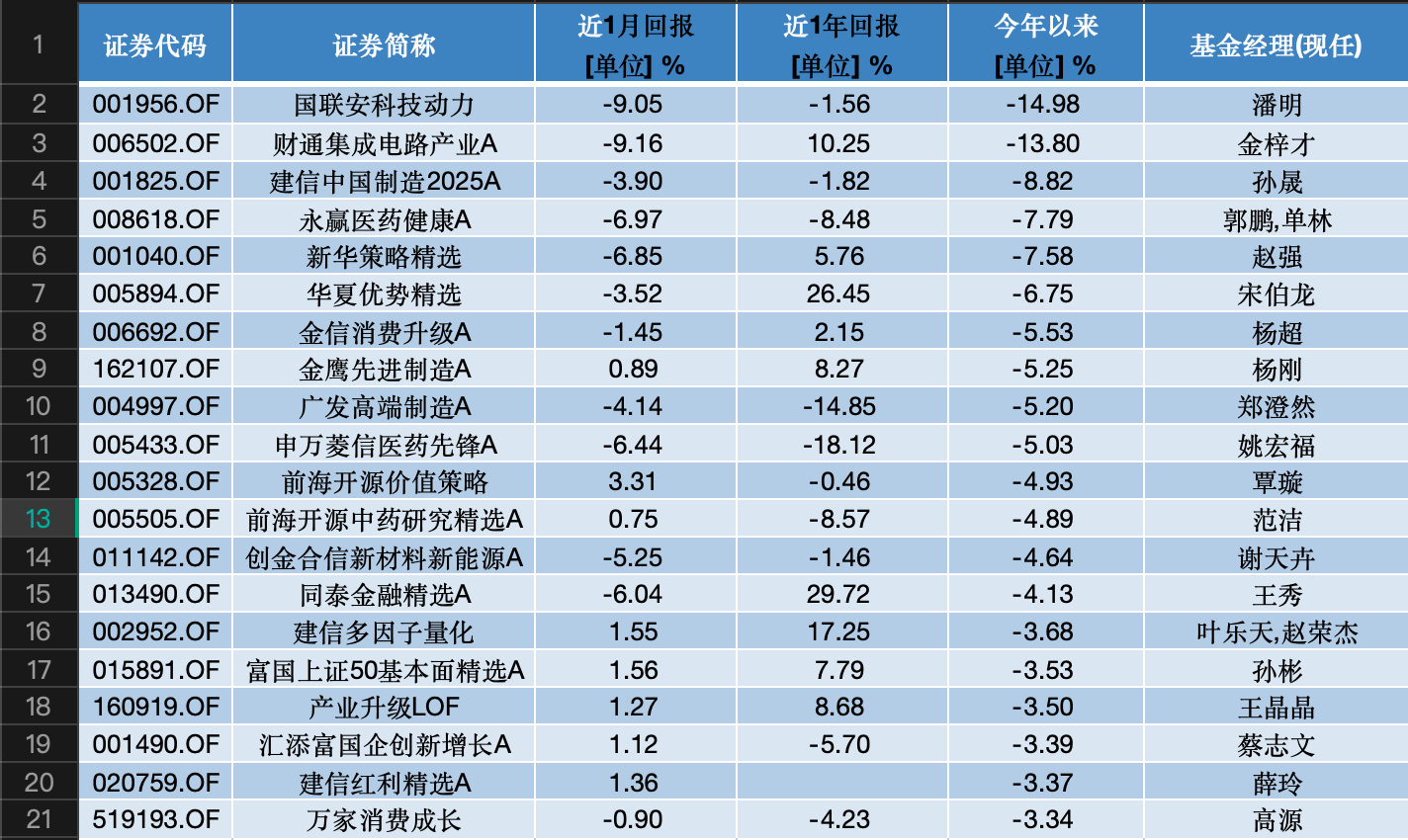 最后,看一下股票型基金的跌幅榜。截至一季度末,股票型基金的跌幅榜名单中,主要产品其实年内跌幅都不大,普遍不到10%,年内跌幅3%都能进入跌幅前20。
