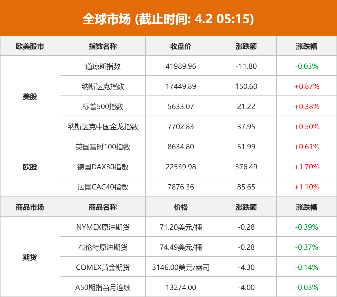 商品市场:国际油价1日下跌。截至当天收盘,纽约商品交易所5月交货的轻质原油期货价格下跌28美分,收于每桶71.20美元,跌幅为0.39%;6月交货的伦敦布伦特原油期货价格下跌28美分,收于每桶74.49美元,跌幅为0.37%。国际金价收跌,COMEX黄金期货结算价下跌4.3美元,跌幅0.14%,报3146.00美元/盎司。