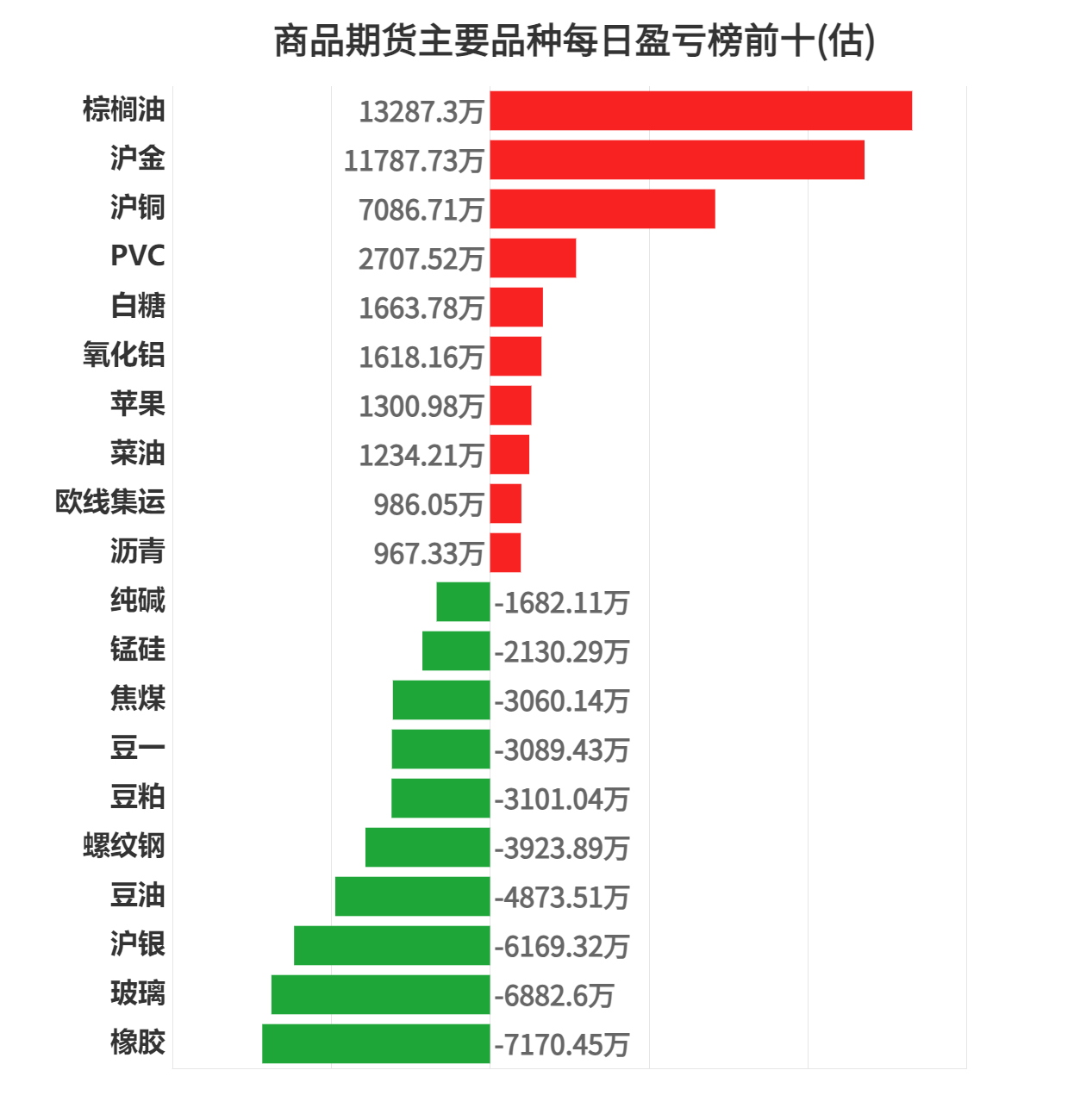 今日商品期货上榜机构席位中棕榈油盈利第一,为13287.30万元。