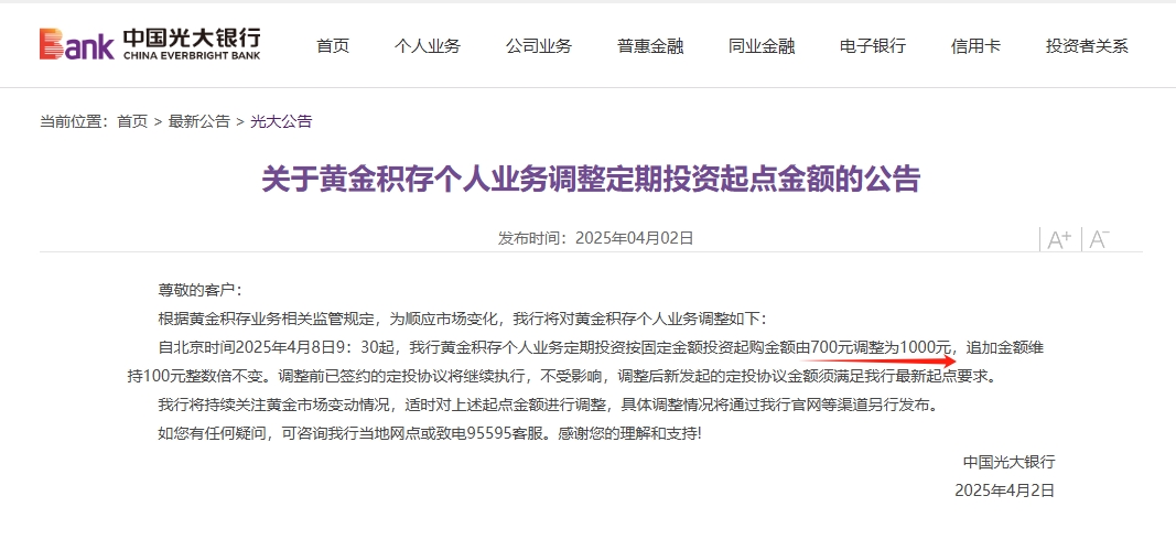 4月2日上午,光大银行发布公告称,根据黄金积存业务相关监管规定,为顺应市场变化,该行将从2025年4月8日9:30起对黄金积存个人业务定期投资起点金额进行调整。