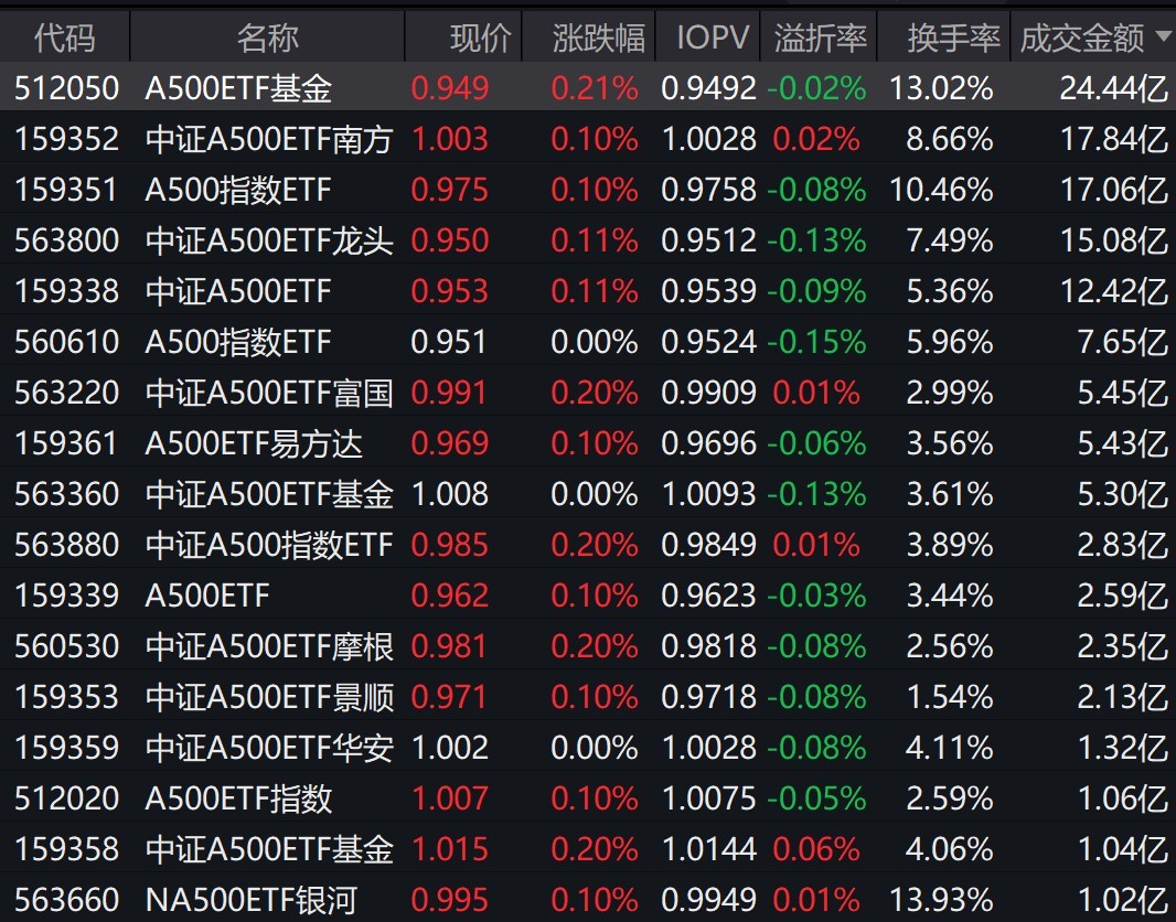 截至上午收盘,场内30只跟踪中证A500指数的ETF多数上涨,其中有17只中证A500相关ETF成交额超1亿元,5只超10亿元,A500ETF基金、中证A500ETF南方、A500指数ETF早盘成交额分别为24.44亿元、17.84亿元、17.06亿元。
