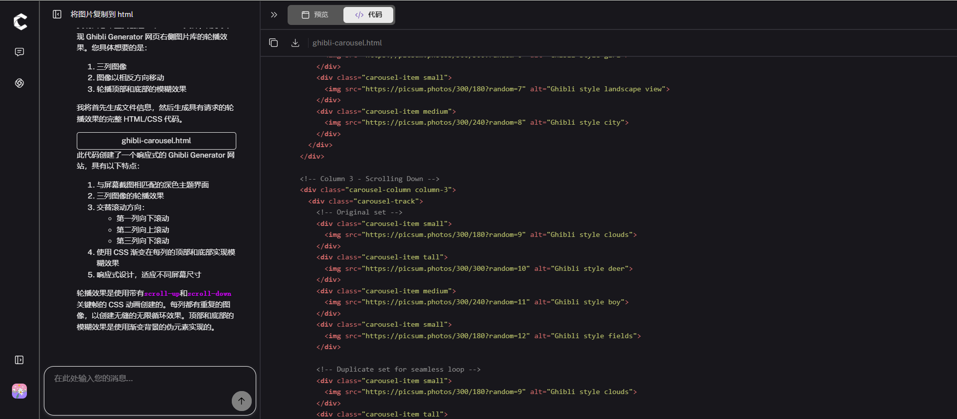 此外,只需通过自然语言提示词就能灵活调整设计细节,如动画、颜色、图片布局样式等,无需手动修改代码,让设计与开发流程更加高效流畅。