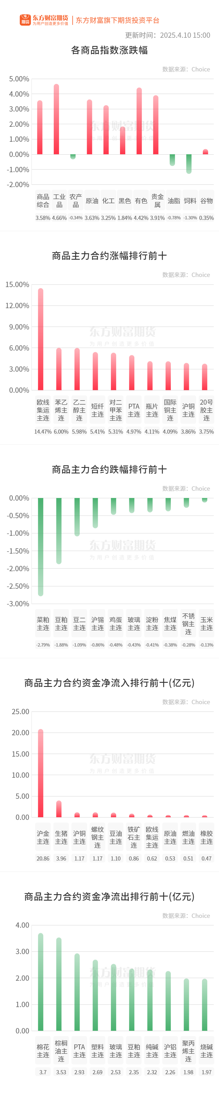 据Mysteel,截至4月10日当周,螺纹钢表需连续第八周增加,厂库由降转增,社库连续第五周减少,产量连续三周增加。(我的钢铁网)