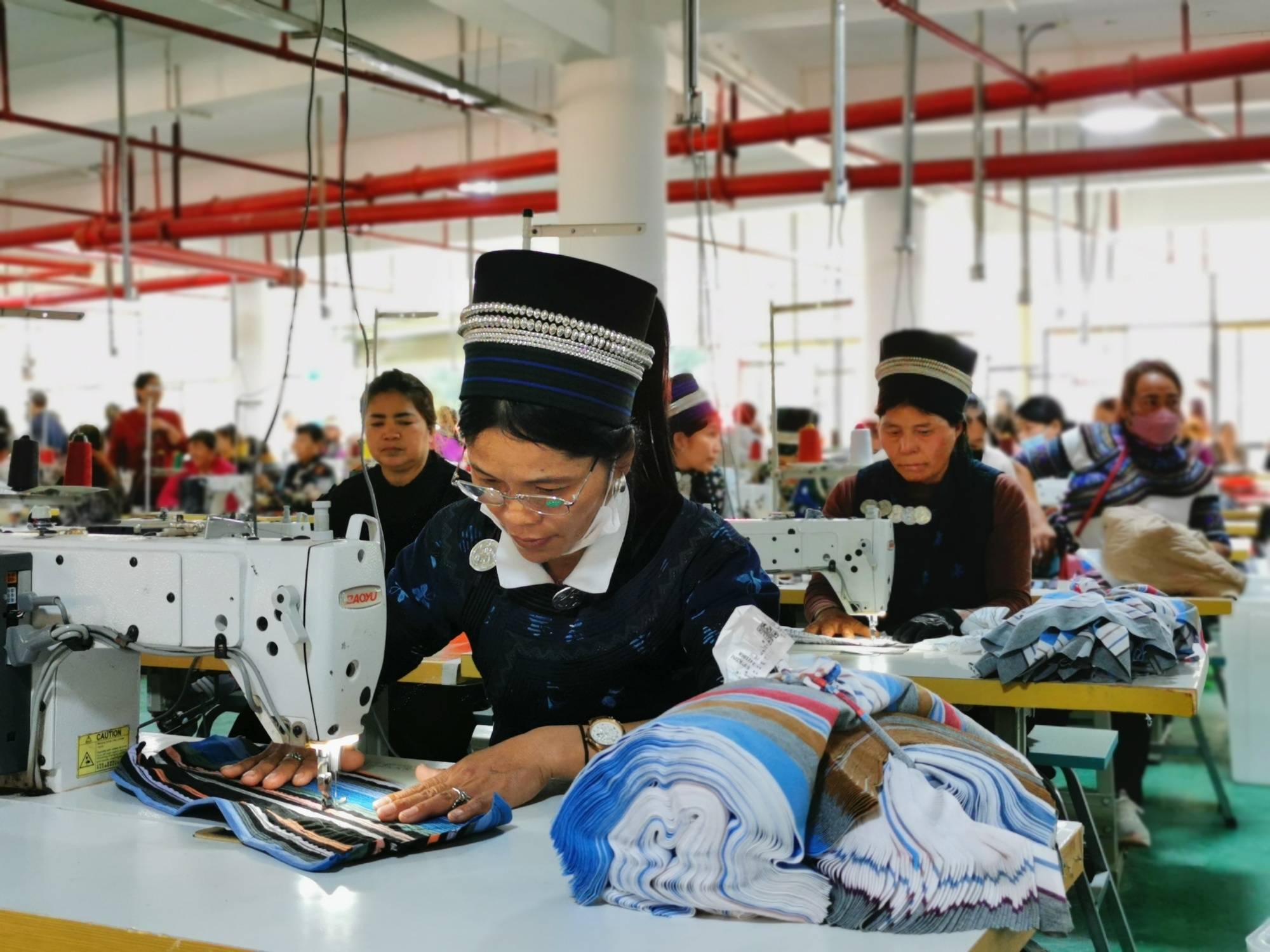 △云南红河州一纺织厂内,女工们正在缝制衣物。