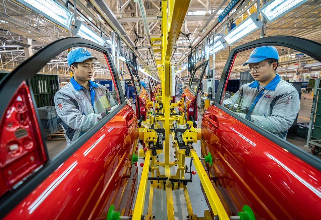 △山西一家新能源汽车生产基地,工人们正在组装新能源车车门。