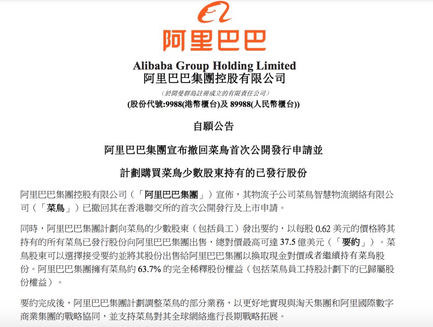 【TechWeb】3月26日消息,今日晚间,阿里巴巴在港交所发布公告,宣布其物流子公司菜鸟智慧物流网络有限公司已撤回其在香港联交所的首次公开发行及上市申请。
